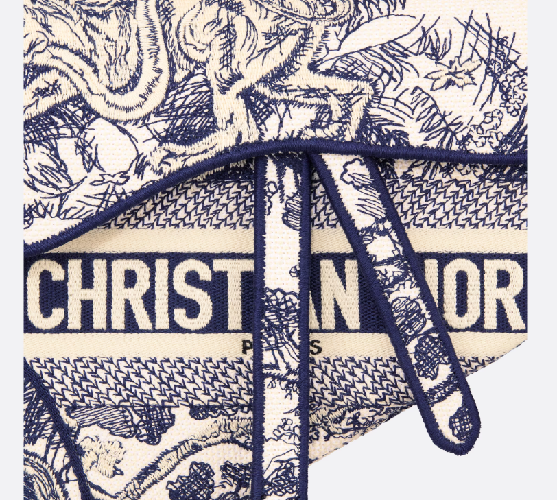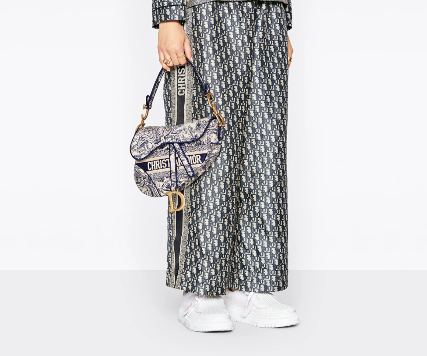 Maria Grazia Chiuri brings a fresh update to the iconic Saddle bag. The design is fully embroidered with the hallmark blue Toile de Jouy motif, further enhanced by a ‘CHRISTIAN D’ signature on the front. The legendary design features a Saddle flap with a magnetic ‘D’ stirrup clasp and boasts an antique gold-finish metal ‘CD’ signature on each side of the handle. The bag can be customized with different shoulder straps and may be coordinated with the season’s other Toile de Jouy creations.