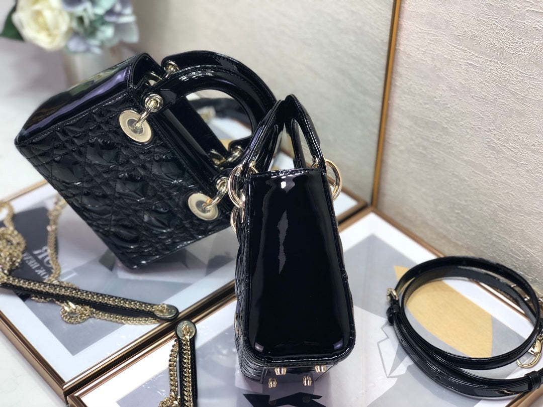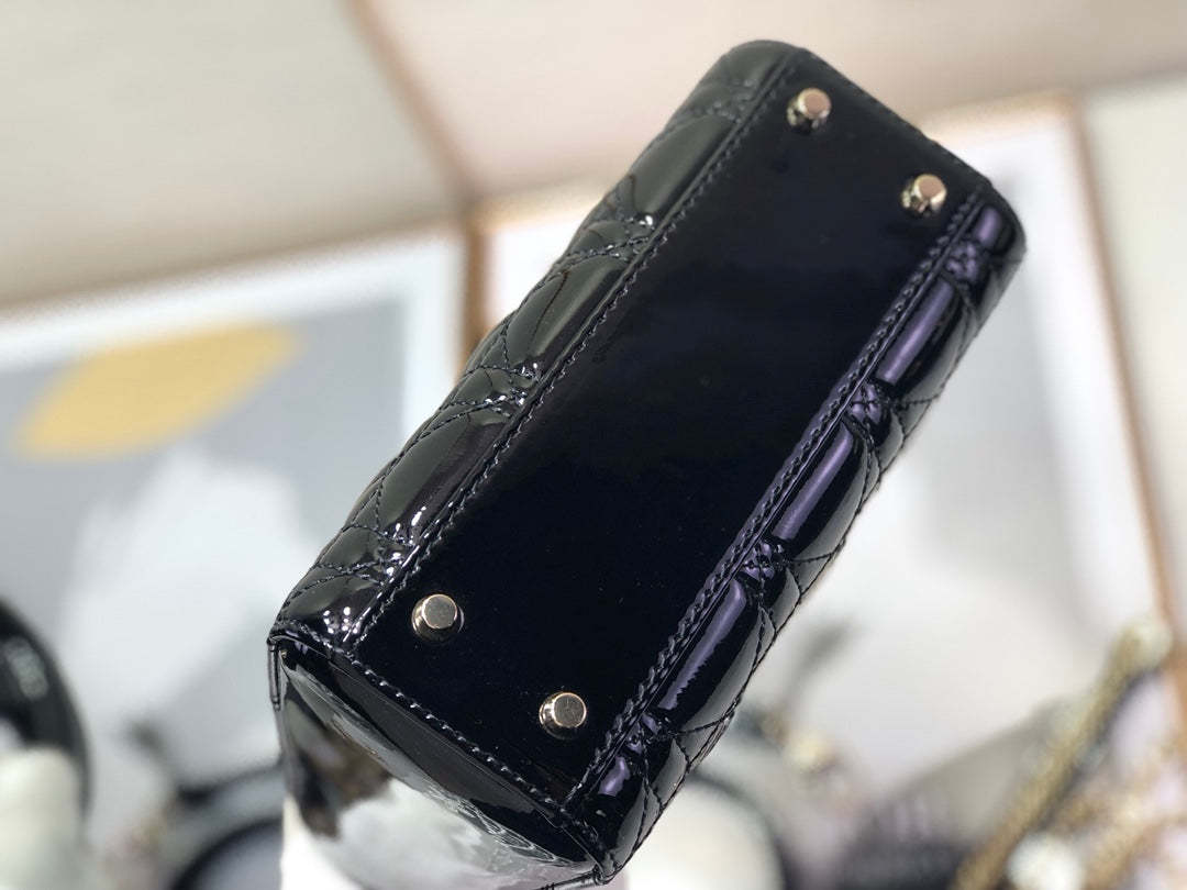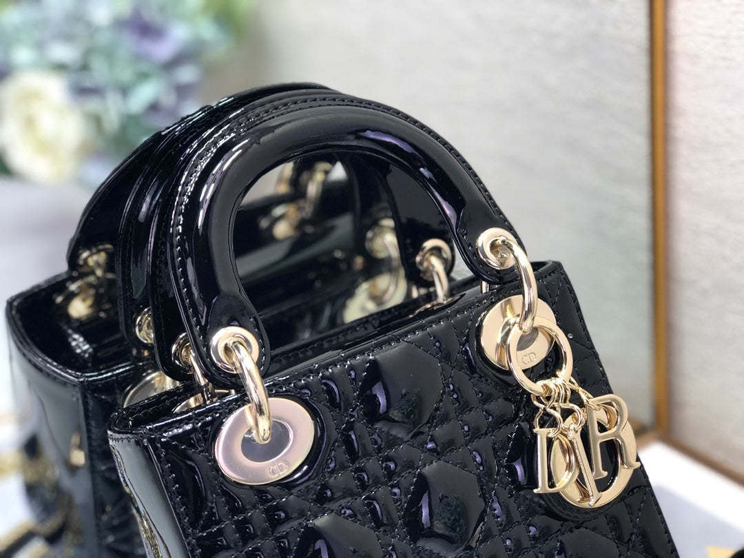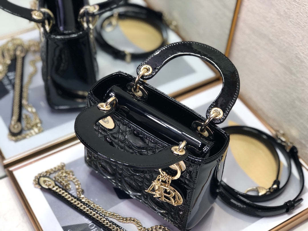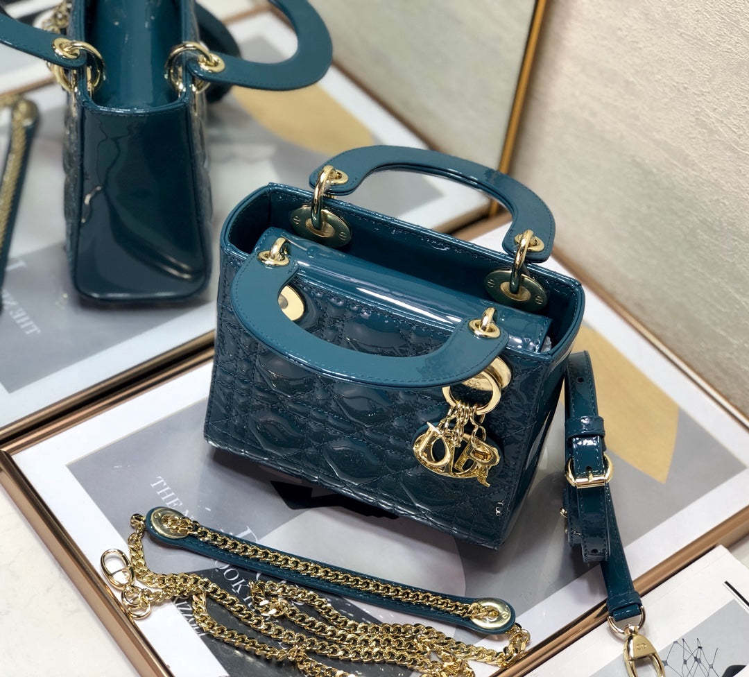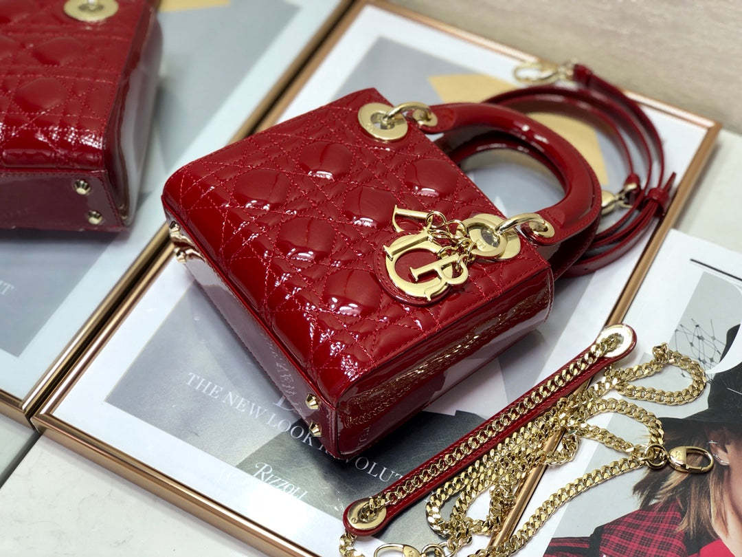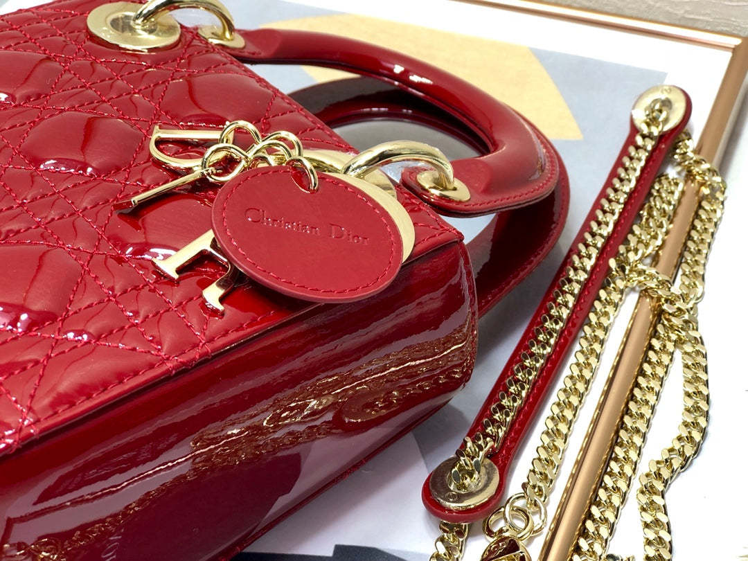 The Lady CD My ABCCD bag epitomizes CD’s vision of elegance and beauty. Sleek and refined. the timeless and modern style is crafted in cherry red patent calfskin with Cannage stitching. creating the instantly recognizable quilted texture. Pale gold-finish metal ‘D.I.O.R.’ charms further embellish its silhouette with an elegant allure. The small style features a thin. removable leather shoulder strap and can be carried by hand. worn over the shoulder or crossbody.