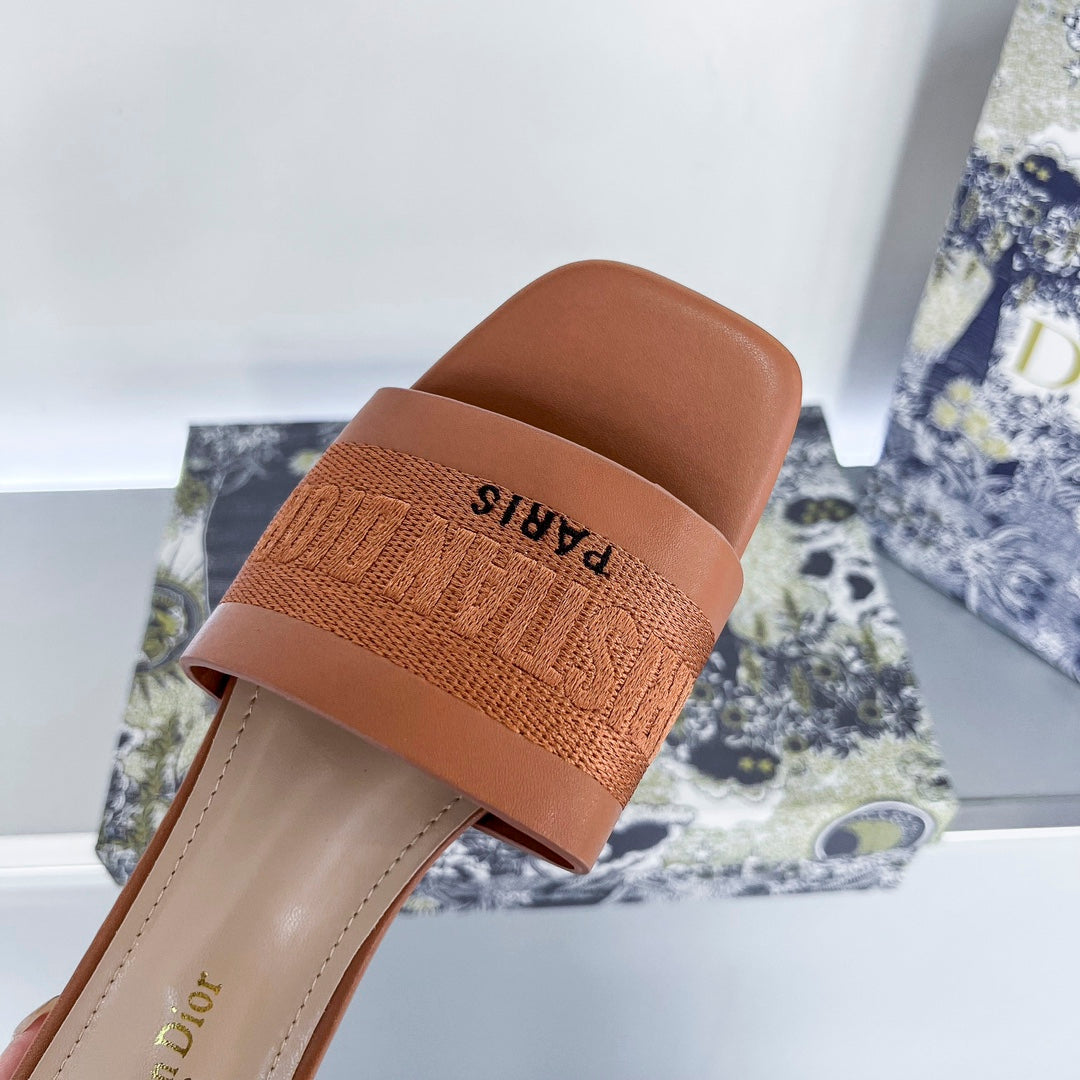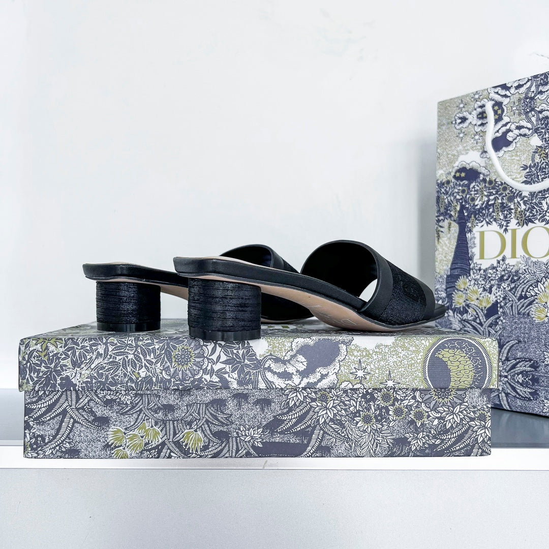 - Part of the Or capsule, the Dway heeled slide revisits a hallmark creation in a modern variation. Crafted in gold-tone satin embroidered with metallic thread, it showcases the signature embroidered on the upper as well as a very contemporary square toe. Completed with a 3.5 cm (1.5) cylindrical heel, the slide will lend a modern touch to any attire and will pair effortlessly with other Or creations.