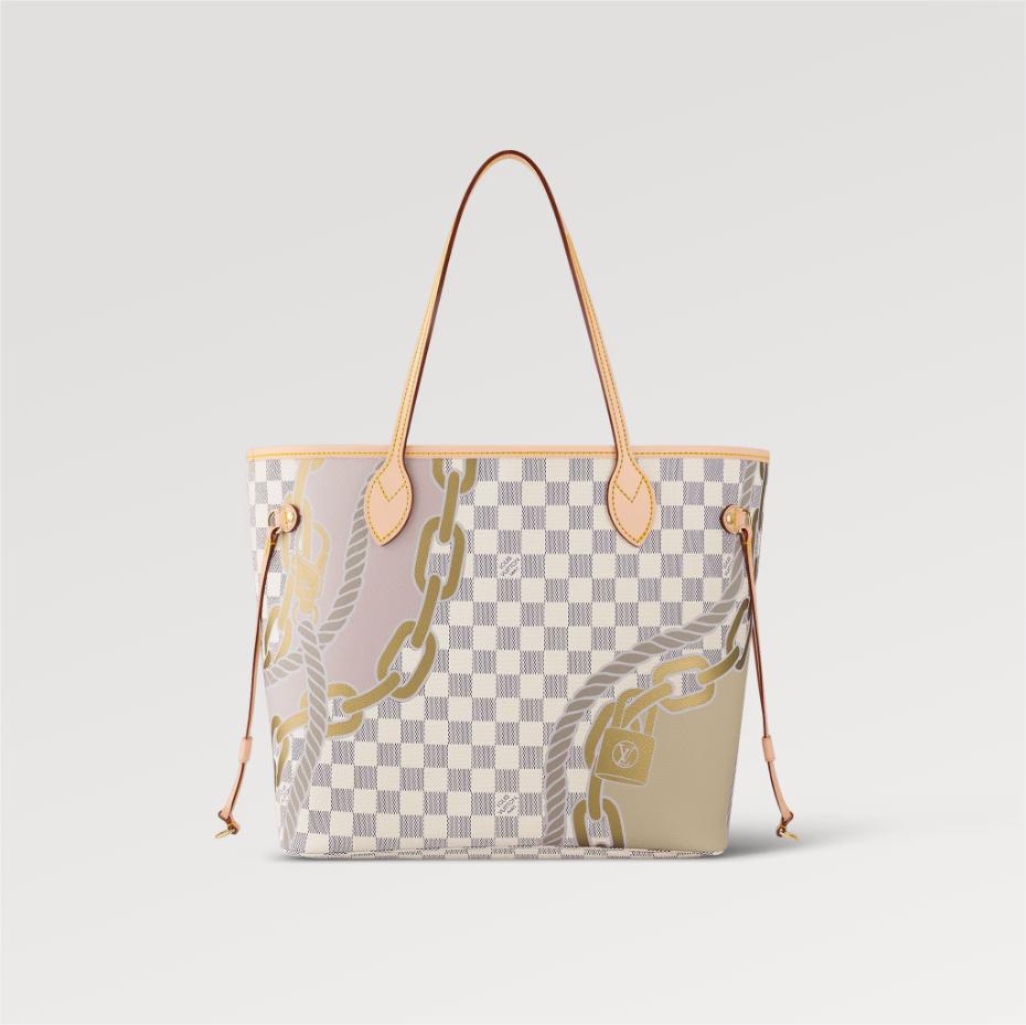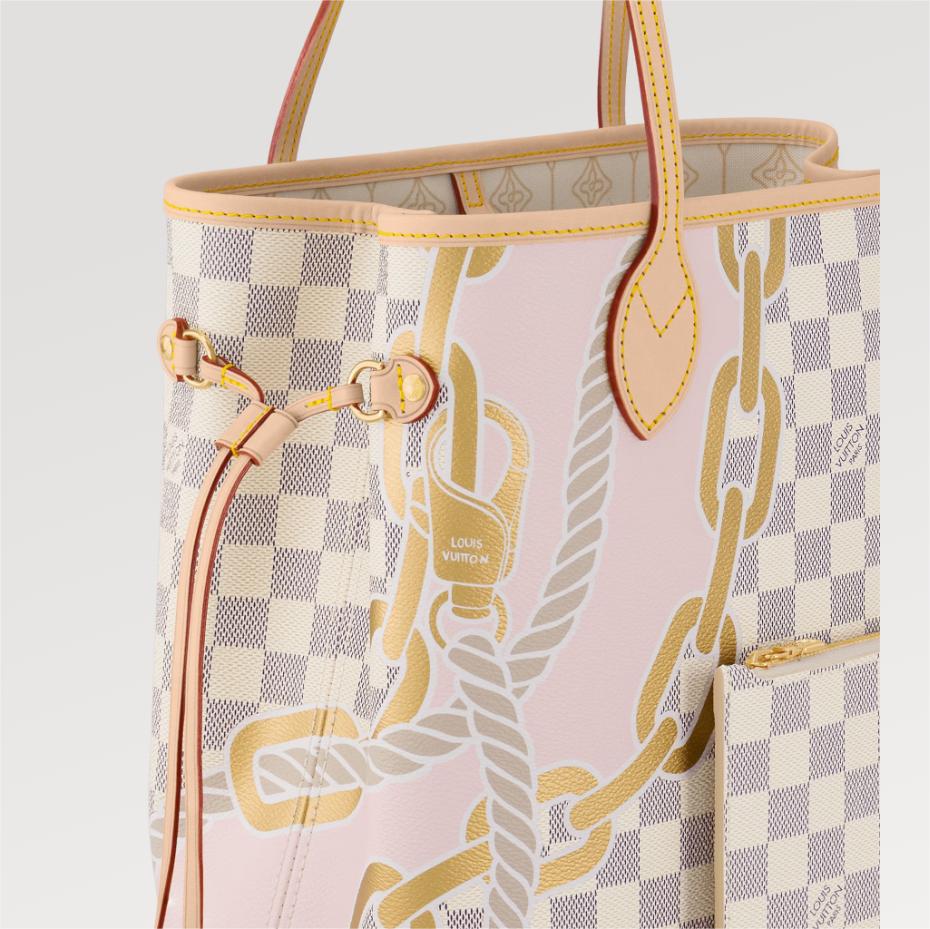 This Neverfull MM tote bag is made from Damier Azur coated canvas customized with a bold five-color nautical print of ropes and chains. bringing a fresh twist to the classic checkerboard pattern. This versatile bag features side laces that can be cinched for a sleeker silhouette or loosened for a more casual look.